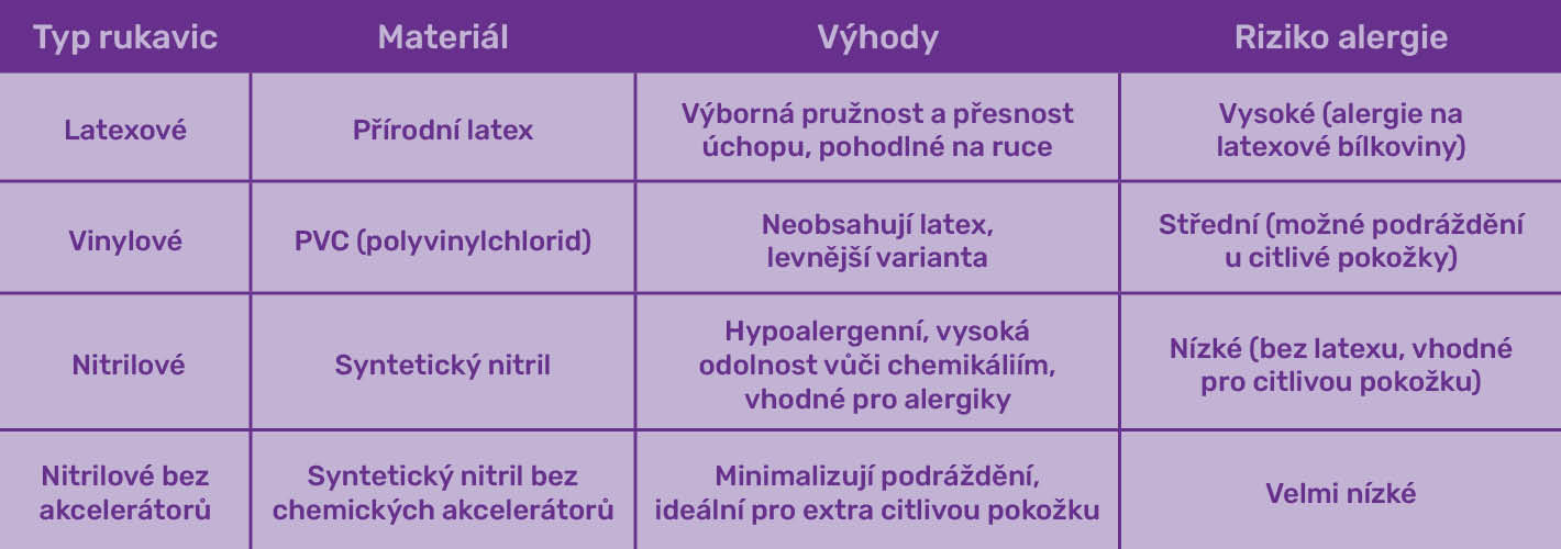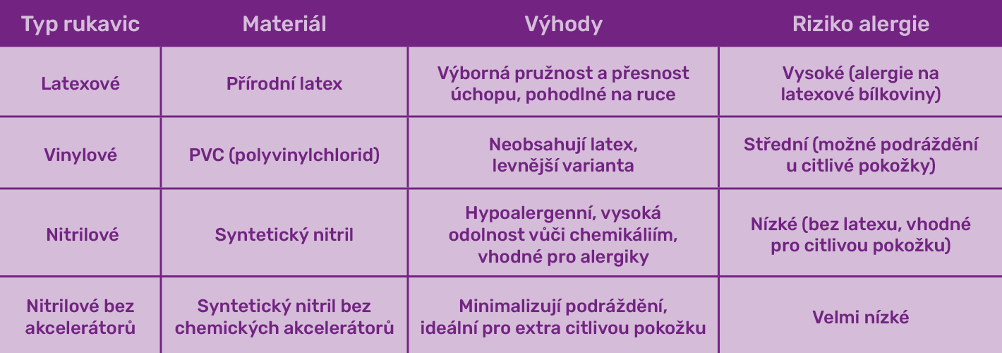 Nejuniverzálnější volbou jsou nitrilové rukavice, které jsou odolné a hypoalergenní. Pro extra citlivou pokožku doporučujeme modely bez akcelerátorů nebo rukavice MOISTCARE s vitamínem E a glycerinem.